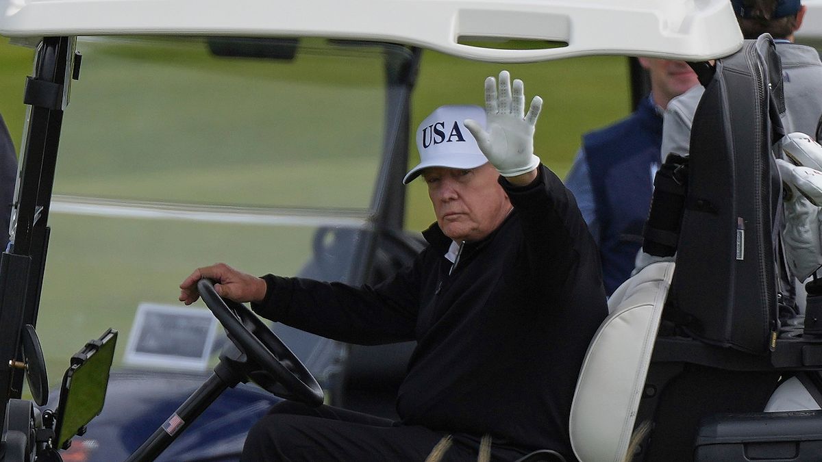 2025年7月26日,美國總統總統在蘇格蘭高球場的球車上對媒體揮手致意。(美聯社)